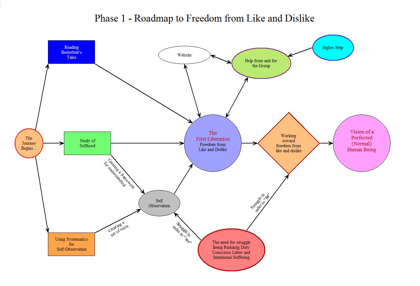 Yes, I did find the roadmap roadmap helpful - graphics are a good tool for me. As I have been reading the various materials and blogs I have been formulating the whole situation as: As I am I am unable to like what I dislike - yet with self observation I can see what I like/dislike and begin to separate (non-identify) which begins to allow me to see more about the event (whatever it is) than what I simply like and dislike, If I can persist with that kind of thinking I can see, feel and appreciate the rewards of not reacting in my usual manner to every event that comes along. I begin to value freedom from like/dislike and wish for that freedom rather than approach non identification as a task. I feel I received a good bit of help all last week.